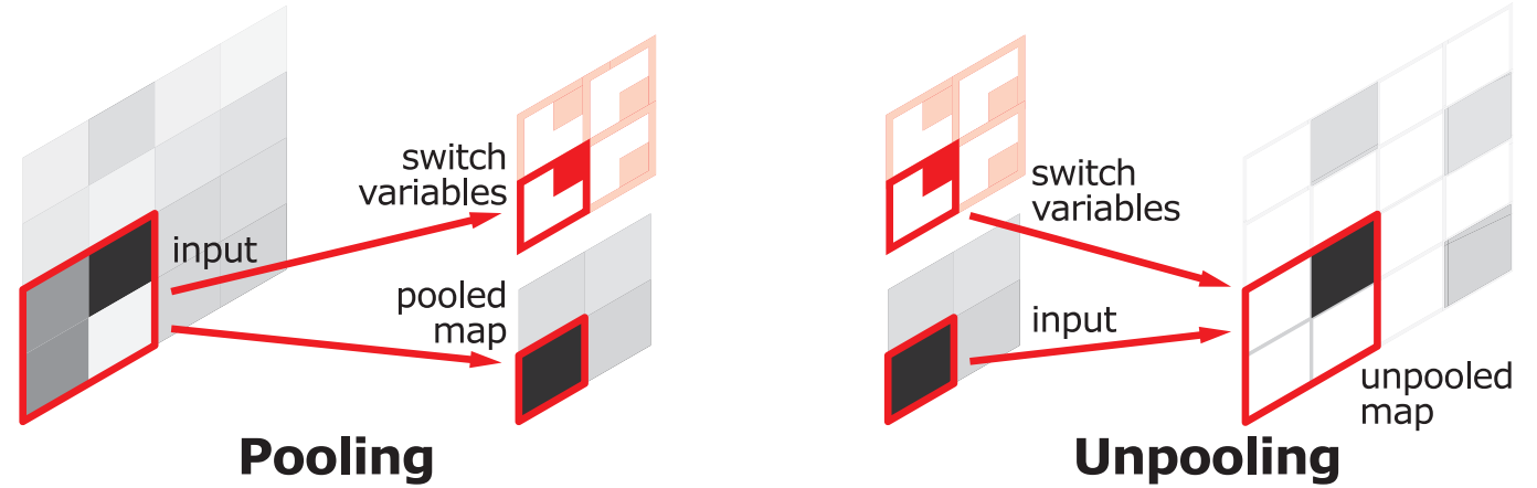 Pooling과 달리 Unpooling할 때는 Input을 receptive field 사이즈의 어느 위치에 두어야 할지 고민일 것이다. Unpooling의 목적은 원래의 모양으로 돌아가는 것이기 때문에 Pooling할 때 선택된 값의 위치(switch variables)를 기억해둔다. 위치를 기억해두었다가 Unpooling할 때 input을 Pooling되기 전의 위치로 두는 것이다. 이때 나머지 receptive field에 해당하는 영역은 0으로 채워주기 때문에, Unpooling의 결과는 꽤 sparse하다. Unpooling은 이미지 복구(Image reconstruction)에서 굉장히 유용하다고 한다.[3]