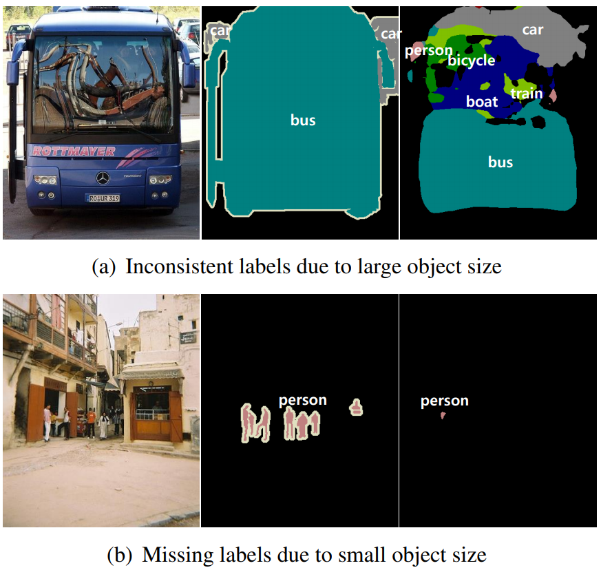 그림 2는 [1]을 기준으로 FCN 기반의 semantic segmenation의 한계를 직관적으로 보여준다. (a)의 object의 크기가 너무 커서 제대로 segmentation하지 못한 결과다. 이는 이미지의 전체적인 맥락(context)을 파악하기에는 receptive field 사이즈가 고정되어 있고, 그 사이즈 안의 맥락만을 반영해서 segmentation했기 때문으로 보인다. (b)는 너무 작은 object에 대해서는 무시하는 결과다.