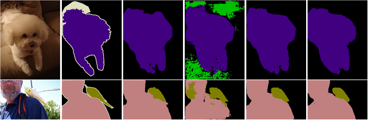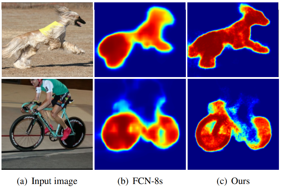 Deconvolution Network는 unpooling layer와 deconvolution layer를 겹겹이 쌓으면서, 미세한 디테일도 포착할 수 있었다. 그림 7은 똑같은 Input image (a)에 대해서 FCN-8s[1] 과 Deconvolution Network의 semantic segmentation 결과를 비교한다. FCN-8s의 경우 강아지와 자전거의 전체적인 형상은 잘 포착했지만, 세밀한 경계 혹은 사람과의 구분에서는 Deconvolution Network의 성능이 우수한 것을 볼 수 있다.