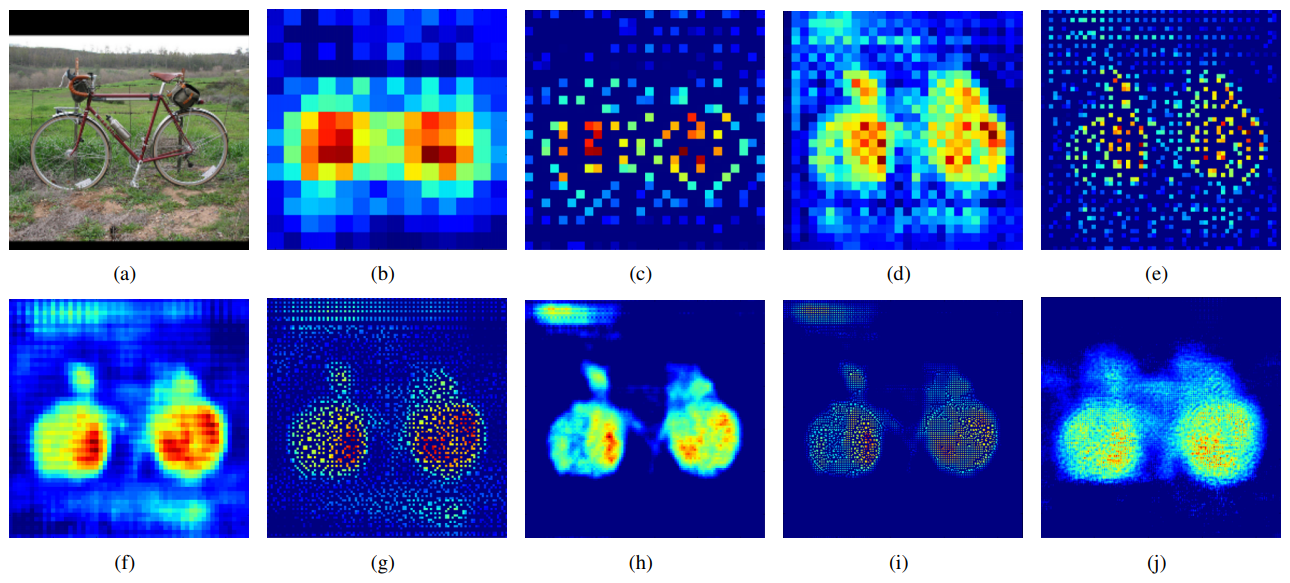unpooling과 deconvolution layer의 output는 명확한 차이를 드러낸다. deconvolution output이 unpooling output보다 Dense하다는 것을 볼 수 있다.(0값을 가지는 픽셀이 거의 없다. 0값을 가질 수록 짙은 파란색) unpooling이 될 때마다 activation map의 크기가 커지면서, 이전 deconvolution output의 noise가 제거된다. 그리고 deconvolution이 진행될 수록 전체적인 형상이 바퀴부터 자전거의 디테일한 특징인 뼈대, 페달을 더 정확히 segmentation하는 것을 볼 수 있다.