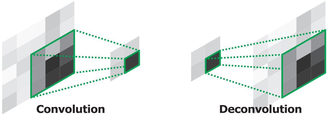 그림 5를 보면 Convolution은 filter window(3x3)의 activations로 하나의 값을 도출하고, Deconvolution은 반대로 하나의 activation을 filter의 모든 값과 곱해 filter window 크기(3x3)의 activations를 생성한다. Deconvolution 결과는 Dense해질 뿐만 아니라 사이즈도 커진다. 본 논문에서는 이전 Unpooling 결과의 크기에 맞춰서 Deconvolution 결과의 가장자리를 자른다.