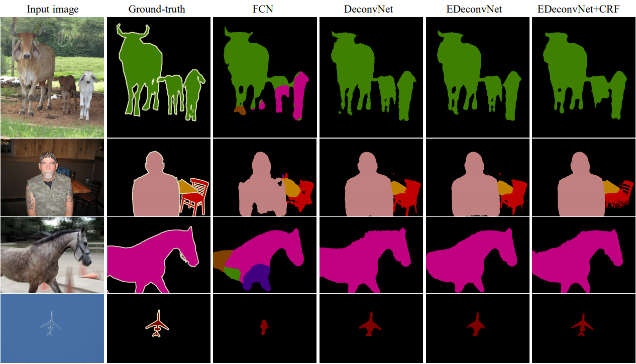 그림 11, 12, 13의 EDeconvNet+CRF는 앙상블 모델에 CRF를 추가 적용한 결과이다. 논문에서는 질적(qualitative)으로는 크게 개선되지는 않았지만(EDeconvNet 결과와 비교해 저 정확히 segmentation 되었다는 느낌으 크지 않다.), 양적(quantitative)으로는 개선되었다고 한다. (모델 성능 지표(mean IoU) 기준)