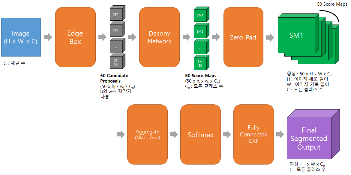두번째 학습 데이터셋을 만들때와 마찬가지로 Edge Box를 이용해 이미지의 관심 객체(object proposal, candidate proposal)를 뽑아낸다. 2000개 정도의 관심 객체 중에 객체 점수(objectness score)가 높은 50개를 뽑는다. 그림 8에서 Proposal이 많을 수록 Segmentation 결과가 더 좋아지는 걸 볼 수 있었는데, 실제 신경망을 구현할 때 50개 정도면 충분히 좋은 결과를 보인다고 한다. 50개 proposal은 Deconvolution Network를 통과해 각각 학습된 클래스 수(Cn)만큼의 채널을 갖는 Score Map이 된다.
