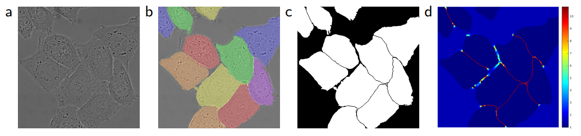 본 논문의 과제는 세포 이미지(그림 1)에서 세포막과 배경, 서로 맞닿은 세포막(Touching objects of the same class)을 구분하는 세그멘테이션이다. 세그멘테이션을 위해서는 두 가지 조건이 있다. 먼저 위치 검출(Localization) 성능이 좋아야 한다. 이미지 분류(Image Recognition) 과제에서는 이미지에 어떤 객체가 있는지 분류만 하면 된다. 세그멘테이션에서는 분류하고자 하는 클래스별로 객체가 어디에 위치해 있는지도 정확히 알아야 한다. 두번째로 Deep CNN기반 세그멘테이션 모델을 학습시키려면 데이터가 많아야 한다. Semantic Segmentation 모델은 픽셀마다 레이블된 이미지로 학습한다. 그런데 바이오 분야에서는 픽셀마다 레이블된 이미지를 구하기 어렵다. 여러 가지 이유가 있겠지만, 일상적인 이미지는 누구나 레이블링할 수 있는 반면 바이오 이미지를 레이블링할 수 있는 인력은 일정 수준의 전문 지식을 갖춰야 하기 때문일 것이다.