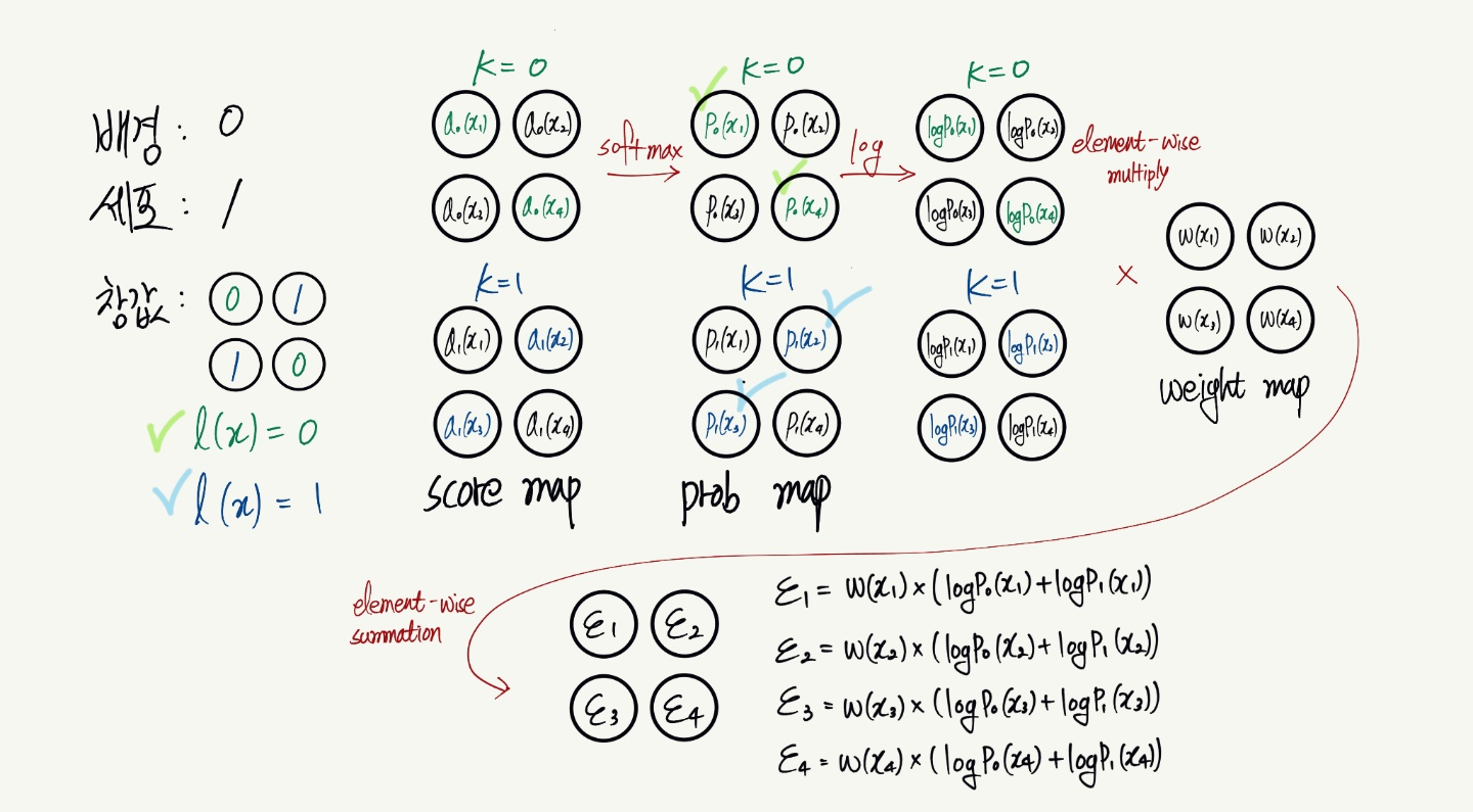 - ℓ(x) : x 픽셀의 참값(label). k채널의 segmentation 맵에서는 k가 클래스를 의미하기 때문에 ℓ(x) = k다.