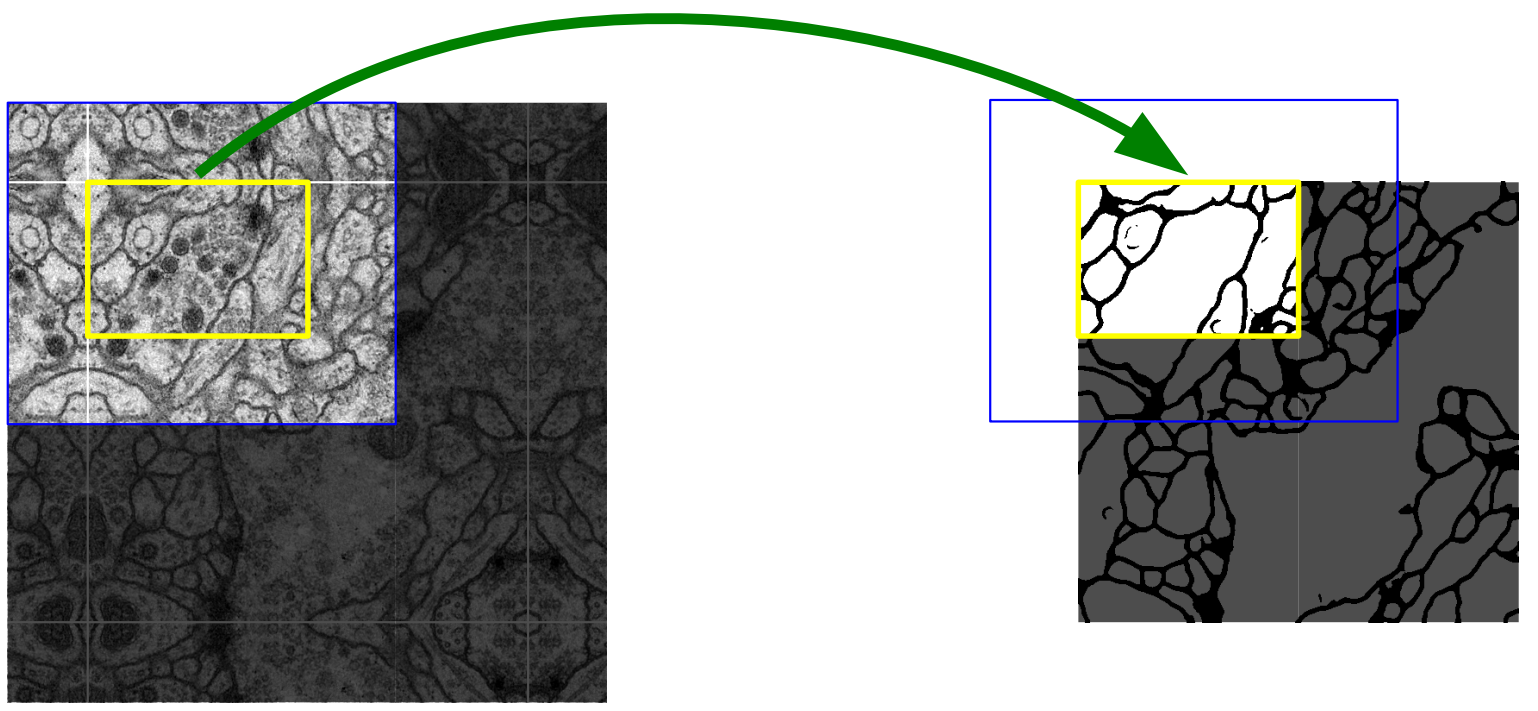 앞서 U-Net이 Input 사이즈보다 Output 사이즈가 작다는 것을 확인했다. 파란색 박스가 노란색 박스의 크기 차이도 같은 맥락이다. Input과 Output의 크기 차이는 tiling 방법에서 input image tile끼리 겹치는(overlap) 현상으로 이어진다. 그림 4의 노란 타일과 바로 오른쪽 타일을 예측하기 위한 input image tile을 상상해보면 상당부분 겹치는 것을 알 수 있을 것이다.