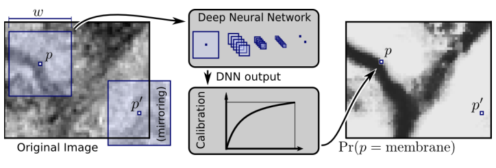 U-Net 이전에 바이오 분야의 이미지 세그멘테이션은 패치 단위 학습을 시도했다. 패치 단위 학습은 이미지 영역 하나로 픽셀 하나를 분류한다. 그림 2는 Ciresan 외 7명이 제시한 패치 단위 학습 방식이다. Original Image를 보면 픽셀 p를 중심으로 가로, 세로 길이가 w인 윈도우가 있다. 이 윈도우를 '패치'라 한다. 패치를 신경망(DNN)에 입력해 픽셀 p를 분류한다. 동일한 방법으로 모든 픽셀을 분류한다. 이때, 패치의 크기는 w로 일정하다.