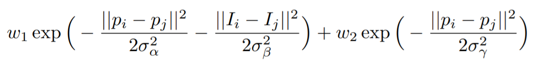 첫번째 커널은 두 픽셀의 위치(p)와 색(I)와 관련있다. 두번째 커널은 위치로 결정된다. 하이퍼 파라미터 σα, σβ, σγ는 가우시안 커널의 스케일을 조절한다. 값과 학습 방법은 5장에서 설명한다.