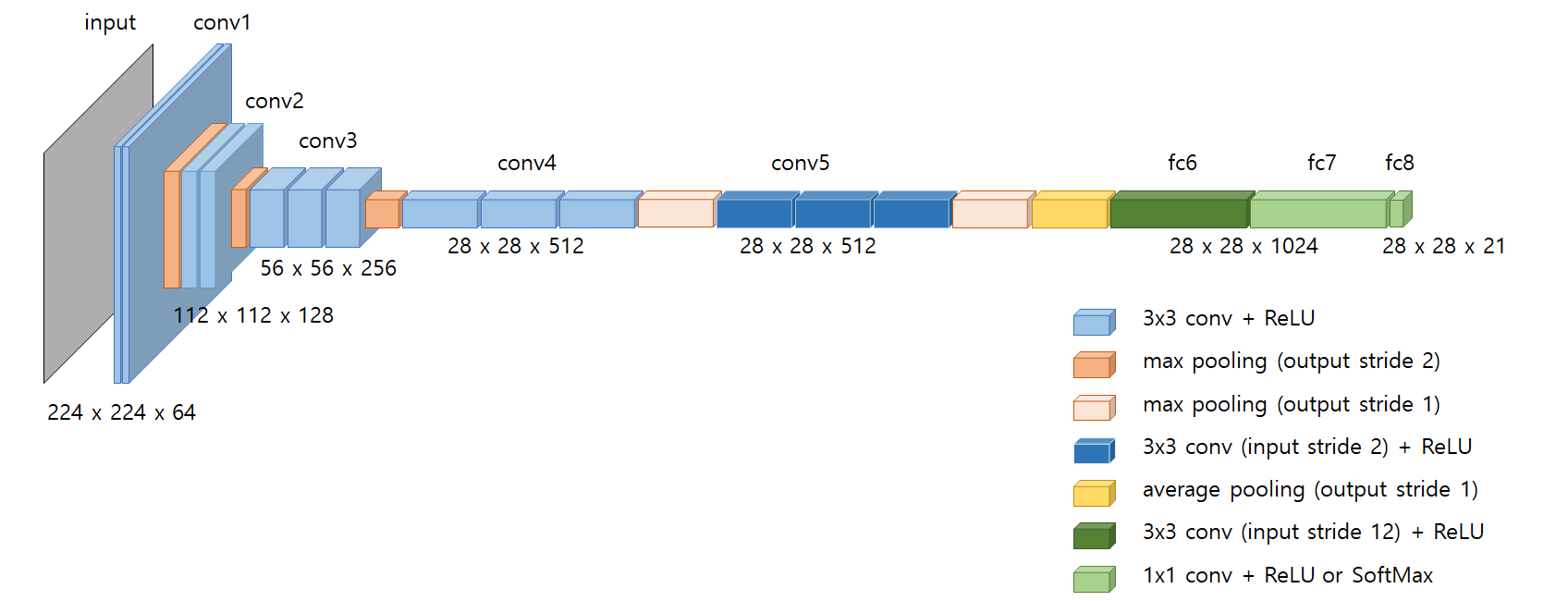 DeepLab v1에서는 그림 2와 같이 FCN[5]과 같이 네트워크 모든 층을 합성곱층으로 만든 VGG16을 사용한다. 그림 2의 output stride는 윈도우가 슬라이딩하는 간격을 말하고, input stride는 3. atrous convolution에서 설명할 rate와 동일한 의미로 사용된다. 서론에서 다뤘던 DCNN을 활용한 세그멘테이션의 문제점을 해결하기 위해서 atrous convolution, fully connected CRF 등을 이용했다.