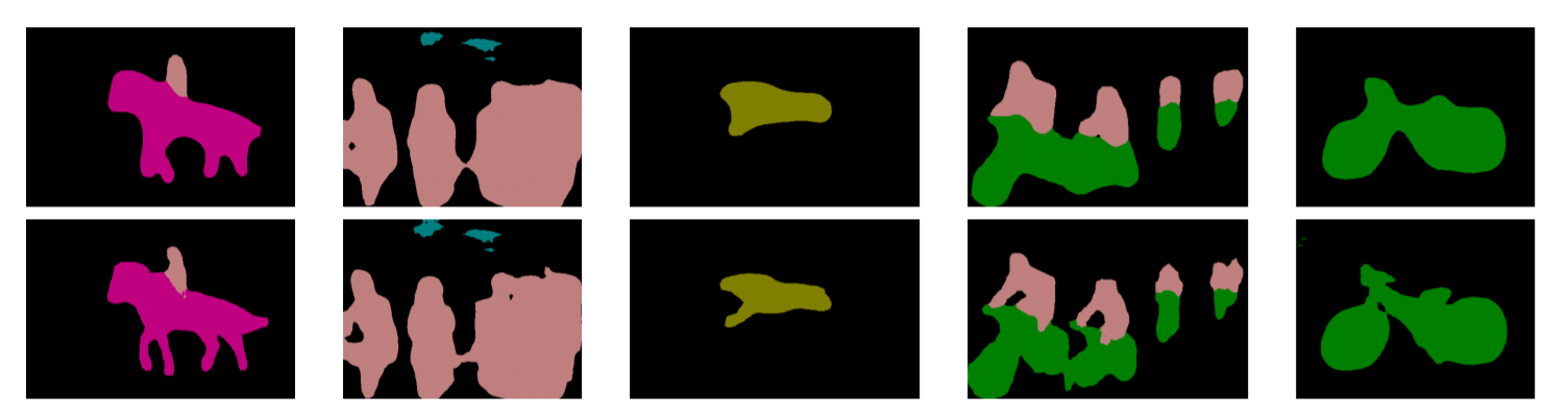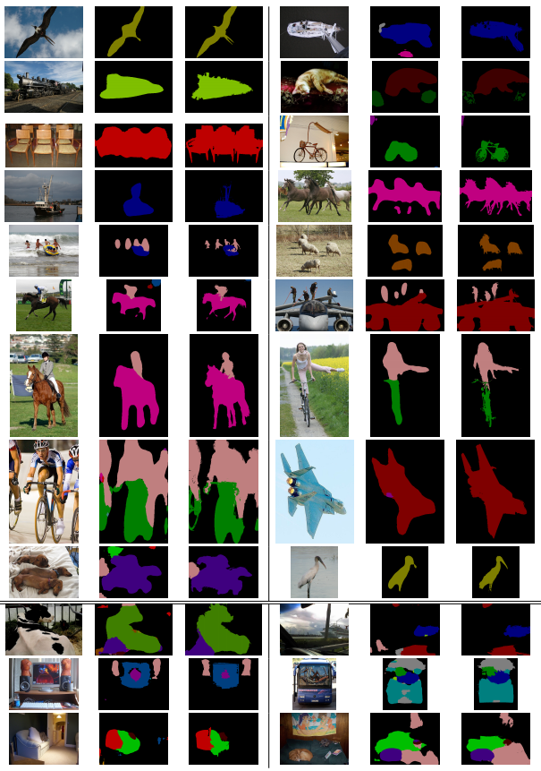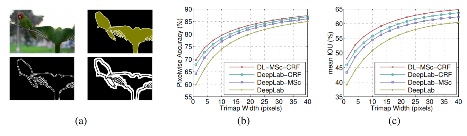 객체 테두리를 기준으로 모델의 성능을 평가하기 위해서 'void'레이블을 이용했다. 'void'레이블은 객체의 테두리 주위를 어노테이션한다. DeepLab 팀은 'void' 레이블을 일정한 두께로 표현하면 그림 9 (a)처럼 객체의 테두리만 그려지는 모습을 볼 수 있다. 이러한 레이블맵을 trimap이라 한다. 그림 9 (b), (c)를 보면 DeepLab 모델 중에서 객체의 형상을 가장 잘 예측한 모델은 DeepLab-MSc-CRF 모델이라는 것을 알 수 있다.