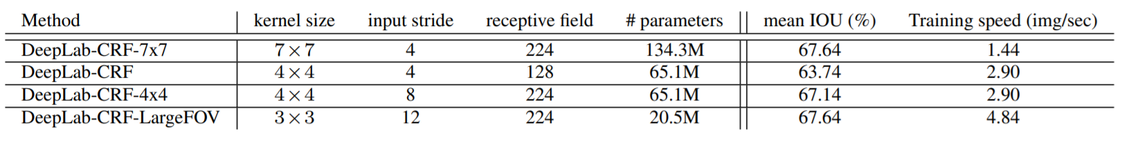 'atrous' 알고리즘을 이용해 DeepLab 모델은 Field-of-View(FOV) 즉, receptive field의 크기를 조절할 수 있다. DeepLab 팀은 fc6 층의 커널 사이즈와 input stride를 조절하면서 정확도와 속도 변화를 실험했다. 표 2에 그 결과가 나와있는데, 커널 사이즈를 줄이고 input stride를 키우면(DeepLab-CRF-LargeFOV) 학습해야 할 파라미터가 줄어들어 속도가 빨라지고, 성능도 단순히 큰 커널(7x7)을 이용했을 때와 동일하게 나왔다.
