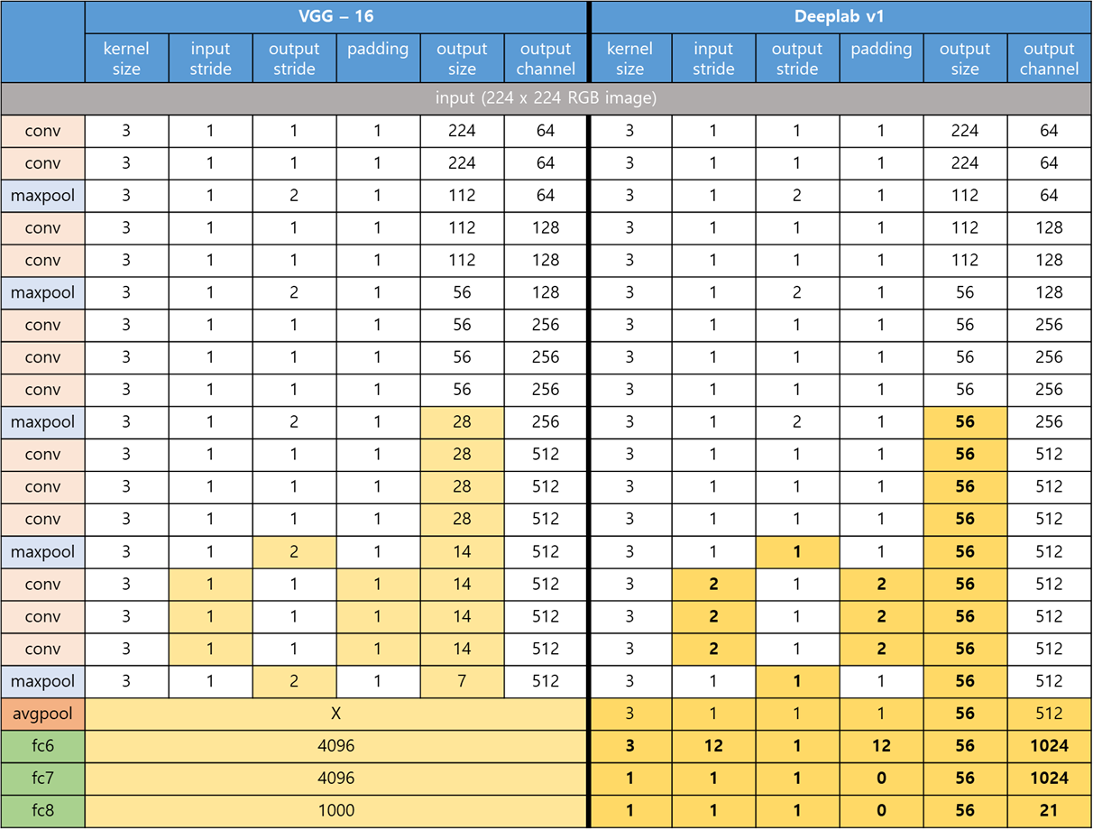 아래 표1은 기존 VGG16과 DeepLab v1에서 수정한 VGG16을 비교한다.