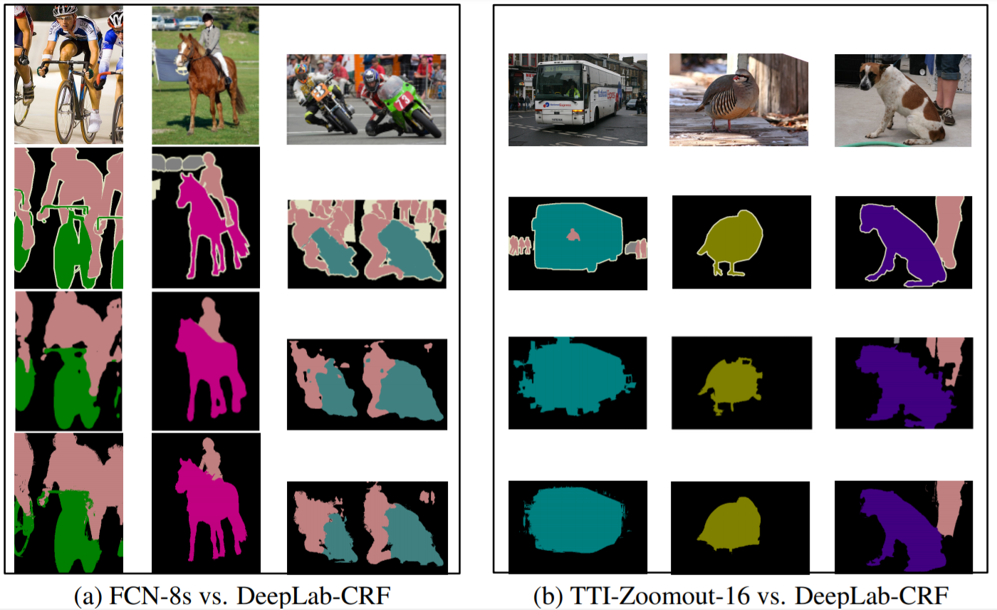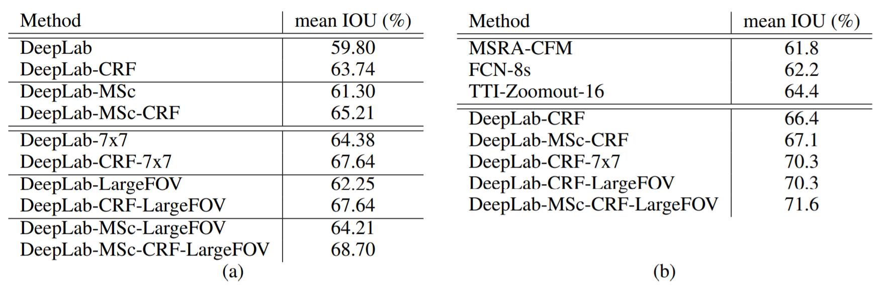 기본적으로 PASCAL 'train'셋으로 학습한 모델을 'val' 셋으로 검증한다. 표 1 (a)가 이 방법으로 평가한 DeepLab 모델들의 성능을 보여준다. fully connected CRF를 사용하면 기본 모델보다 4% 정도 성능이 향상되는데, 직관적인 성능차이는 그림 n을 보고 알 수 있다. fully connected CRF를 이용하면 객체의 테두리를 더 정확하게 잡아내는 것으로 보인다.