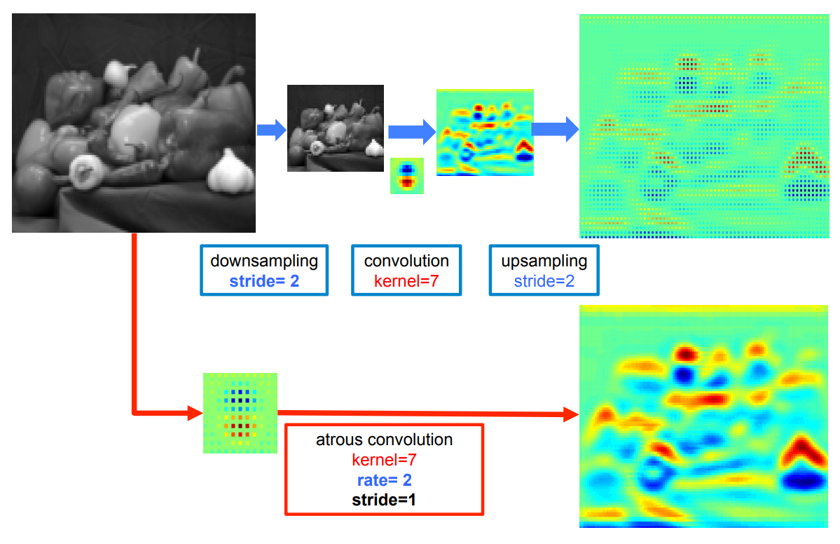 그림 5는 pooling과 convolution을 거친 특징맵을 업샘플링한 결과와 atrous convolution을 이용한 결과를 보여준다. 이를 보면 atrous convolution이 훨씬 더 밀도 있게 표현한다는 것을 알 수 있다.