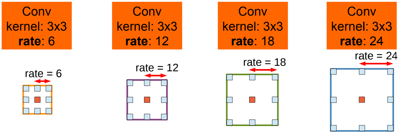 그림 4는 2차원 배열에서 rate마다 atrous convolution을 수행하기 위한 필터가 어떻게 달라지는지 보여준다. 1차원 배열에서와 마찬가지로 기존 3x3 필터(커널)의 파라미터값 사이에 rate만큼 0을 채워준다. 이러한 atrous convolution은 기존의 3x3 필터와 학습해야할 파라미터의 수는 9개로 동일하지만 convolution 연산을 수행하는 윈도우의 크기는 rate가 6인 경우 13x13, rate가 12인 경우 25x25, rate가 18인 경우 37x37, rate가 24인 경우 49x49로 커진다. 결국 필터의 크기가 커진다고 볼 수 있기 때문에 atrous convolution을 필터를 업샘플링한다고 표현하기도 한다.