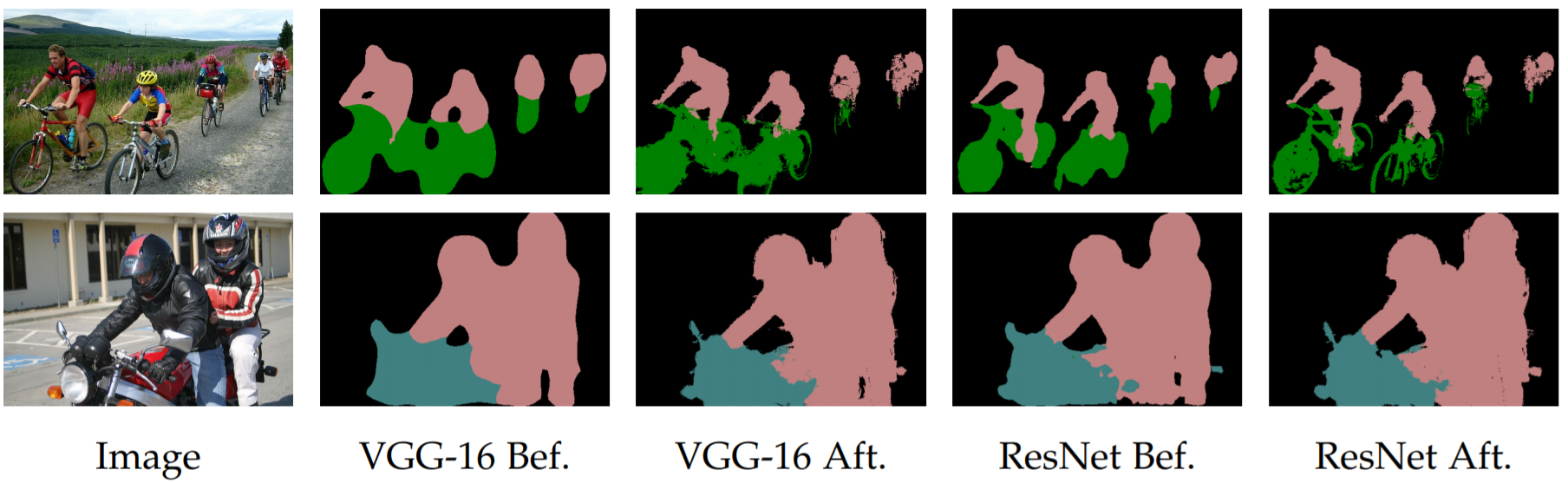 DeepLab v2 논문에서는 그림 6을 제시하며 제안한 모델이 자전거, 의자와 같이 얇은 형상에 대한 세그멘테이션 성능이 떨어진다고 밝혔다. 그리고 인코더-디코더 구조를 이용하면 해결할 수 있을 것으로 예상하며 논문을 마무리한다.
