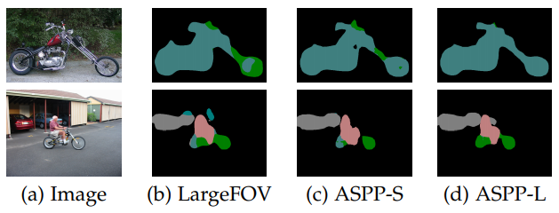 그림 3은 크기가 다른 오토바이의 세그멘테이션을 할 때 ASPP가 얼마나 효과적인지 보여준다. (b) LargeFOV는 그림 2와 같이 ASPP를 사용하지 않고 rate를 12로 atrous convolution한 모델, (c) ASPP-S는 rate를 2, 4, 8, 12로 설정한 모델, (d) ASPP-L은 rate를 6, 12, 18, 24로 설정한 모델이다. ASPP를 이용하고 rate를 크게할 수록 다양한 스케일의 객체 세그멘테이션 성능이 좋아지는 것을 확인할 수 있다.