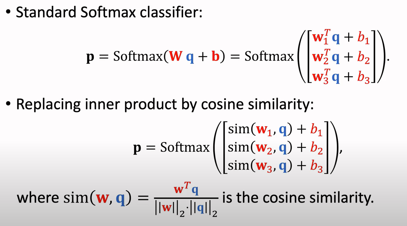Softmax Classfier에서 W와 q의 내적을 W와 q의 Cosine Similarity로 치환할 수 있다. Cosine Similarity는 W와 q의 내적을 정규화한다는 차이점이 있다.