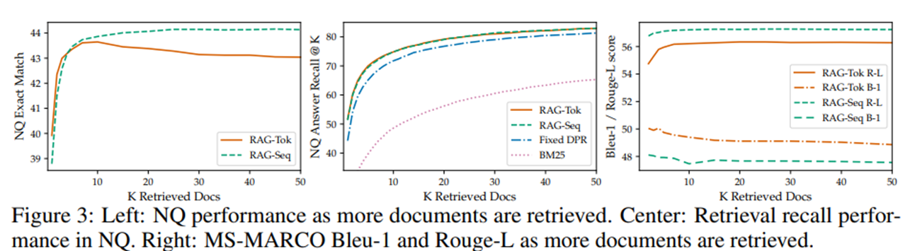 흥미로운 실험 결과만 하나 소개합니다. 몇 개의 문서를 Retrive하는 것이 좋은지 알아보기 위해 NLP Task별로 문서개수에 따라 성능이 어떻게 변화하는지 실험했습니다.대체로 10개 내외에서 가장 좋은 성능을 보이거나 그 이후로는 성능 개선이 크게 없어보입니다.