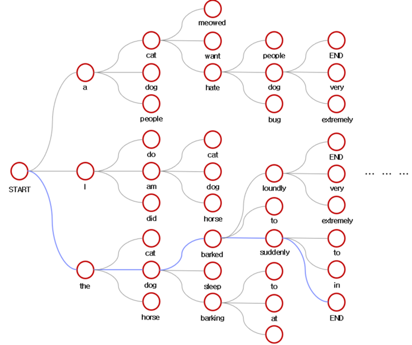Softmax 확률값이 가장 높은 토큰을 선택해서 텍스트를 생성하는 기존 방법은 Greedy Search인데, 이 경우 초기 선택은 최선일 수 있지만, 완성된 Sequence는 최선이 아닐 수 있다는 문제가 있습니다. 위 그림에서 매 분기마다 확률값이 큰 노드가 위에, 작은 노드가 아래에 위치한다고 가정했을 때, Greedy Search로 생성한 문장은 "a cat meowed' 입니다. 하지만 3-Beam Search로 생성한 결과인 'the dog barked suddely'의 평균 확률이 더 높습니다.