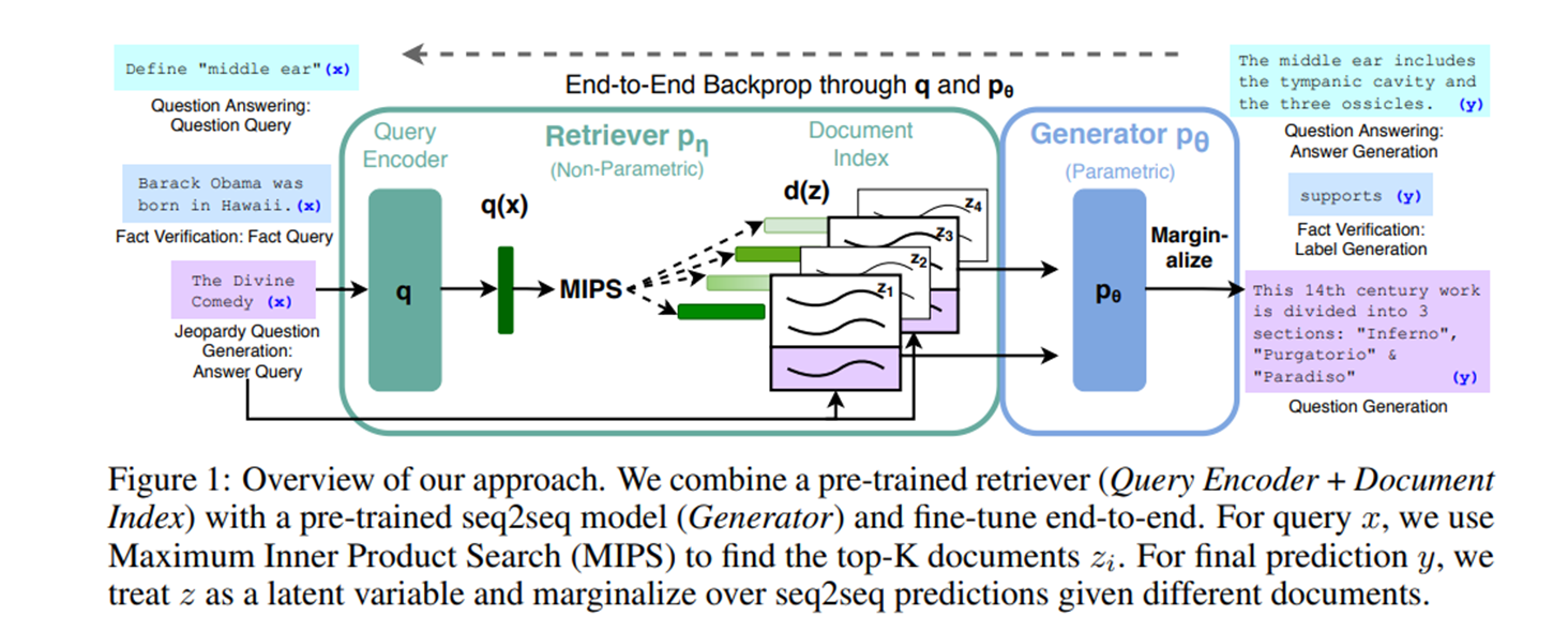 위 그림에 RAG 구조가 그려져 있습니다. 크게 보자면 RAG는 Retriver와 Generator로 구성되어 있습니다. Retriver는 질문과 관련된 문서를 찾는 모듈입니다. Retriver에서는 쿼리 임베딩 모델(q), 문서 임베딩 모델(d)를 이용합니다. 두 모델을 이용해 쿼리와 문서를 임베딩하고, 쿼리와 내적한 값이 높은 문서를 찾습니다.