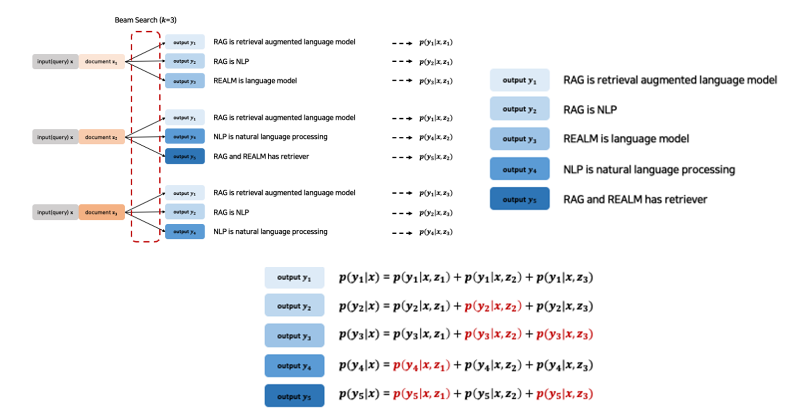 토큰 단위로 문서별 결과를 섞는(Marginalize) 방법은 토큰마다 확률분포를 Beam-Search에 적용하면 됩니다. 3개의 노드를 고를 때 문서별로 결과를 섞은 확률 분포에서 고르는 것입니다.